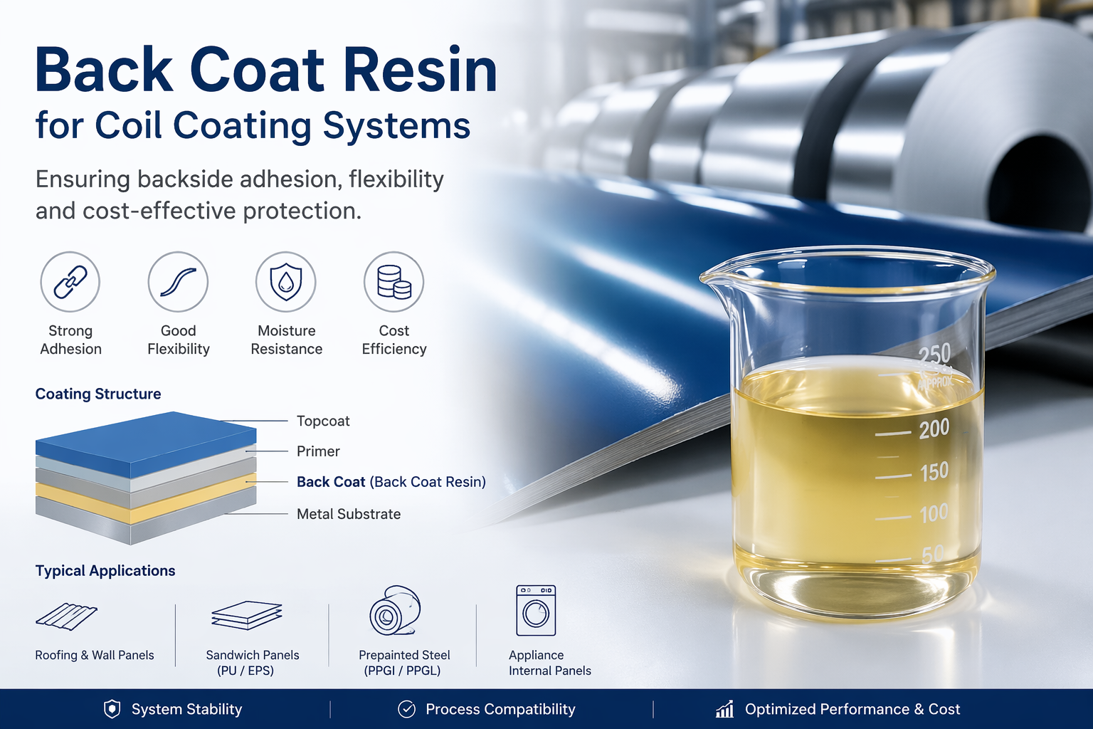 Back coat resin supports the reverse side of a coil coating system. It helps maintain backside adhesion, forming flexibility, and stable coating performance in practical production and end-use conditions.